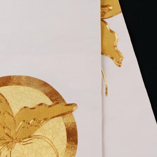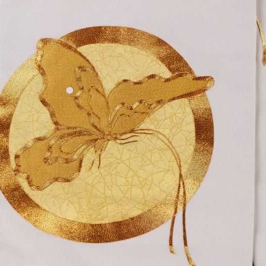 蝶文様が金駒刺繡で表現された名古屋帯です。画像からは帯地の色が真っ白にみえますが、実際は薄めの象牙色です。