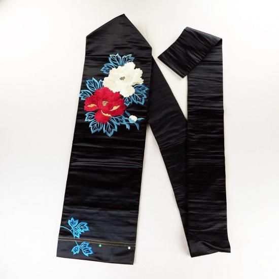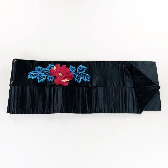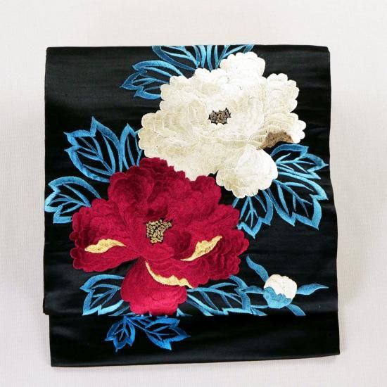 アンティーク帯 黒繻子帯 名古屋仕立 牡丹 新古品